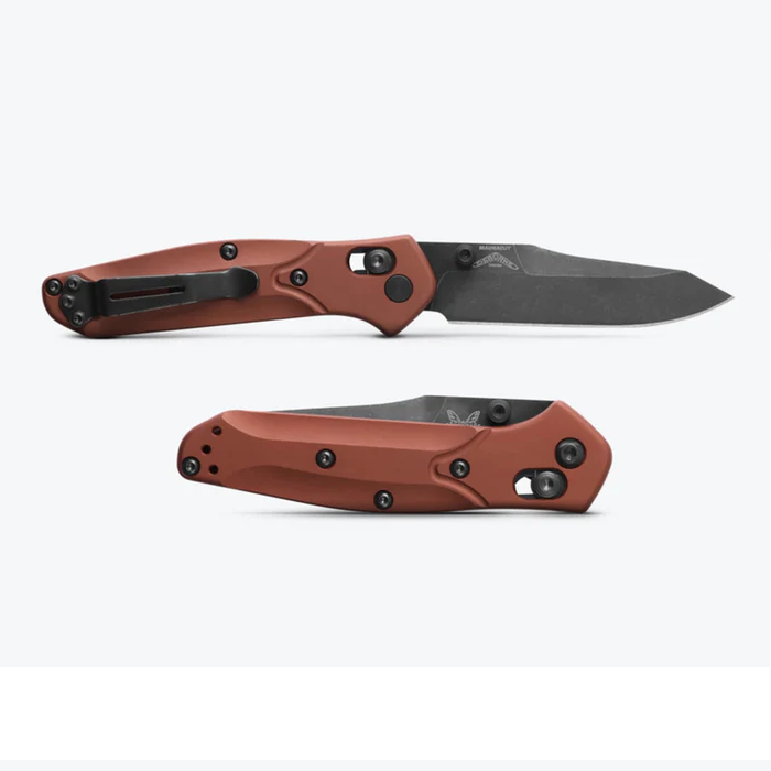 Benchmade Mini Osborne är en kompakt version av den ikoniska Osborne designad för att erbjuda samma höga prestanda och distinkta estetik men i ett mindre, mer fickvänligt format. Denna variant av Mini Osborne kännetecknas av sin smala profil och distinkta reverse tanto-bladform av premiumstålet Magnacut (60-62 HRC). Handtaget är tillverkat av ett grymt snyggt Burnt copper anodiserad 6061-T6 aluminium. Fällkniven är utrustad med Benchmades säkra och ambidextrösa AXIS-låsmekanism vilket bidrar starkt till dess popularitet som en bekväm EDC-kniv.